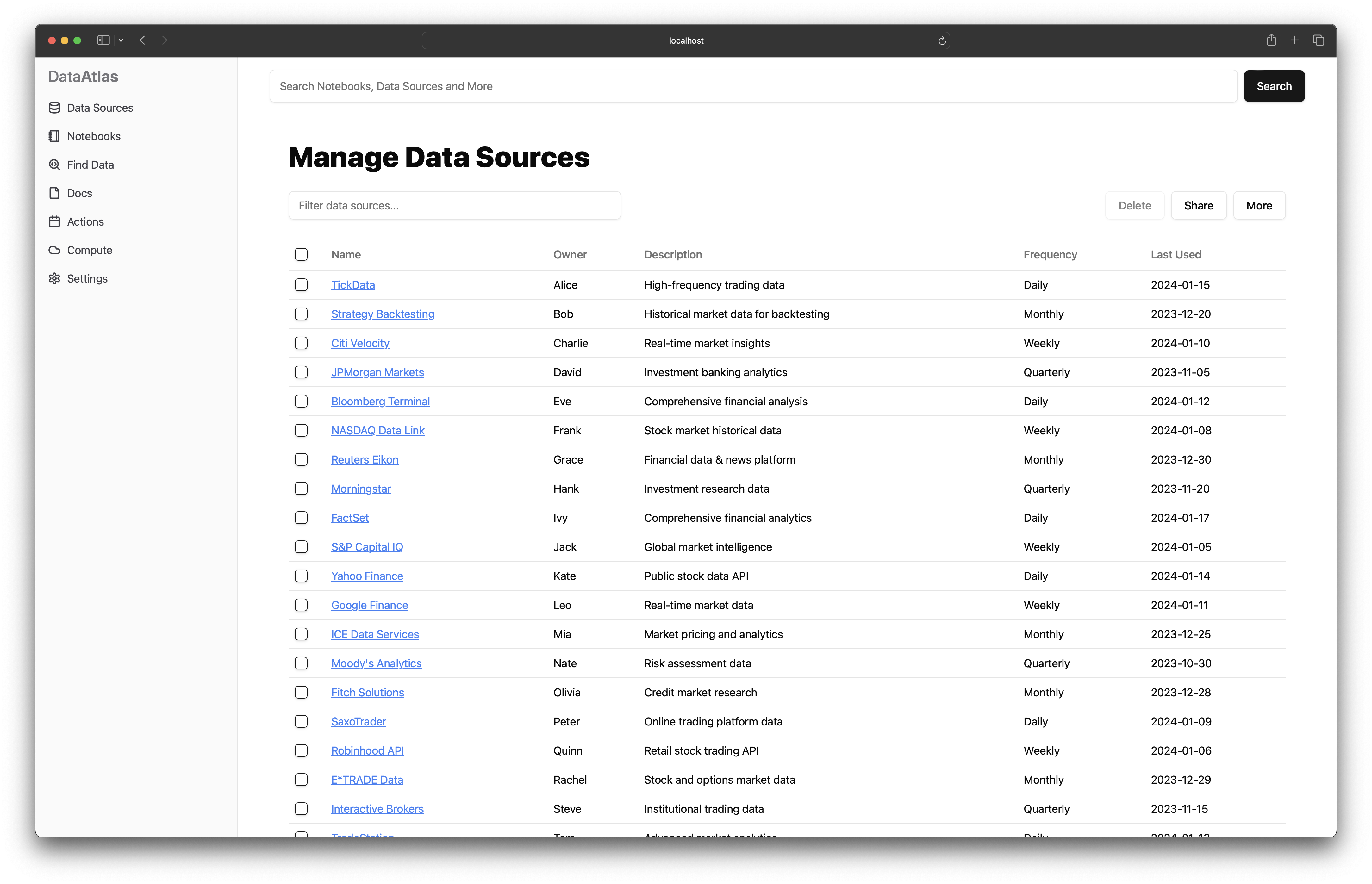 Data Atlas standardizes data delivery from existing sources, providing seamless access through a common Python library and Excel functions. Quickly get started with code samples and generated documentation.